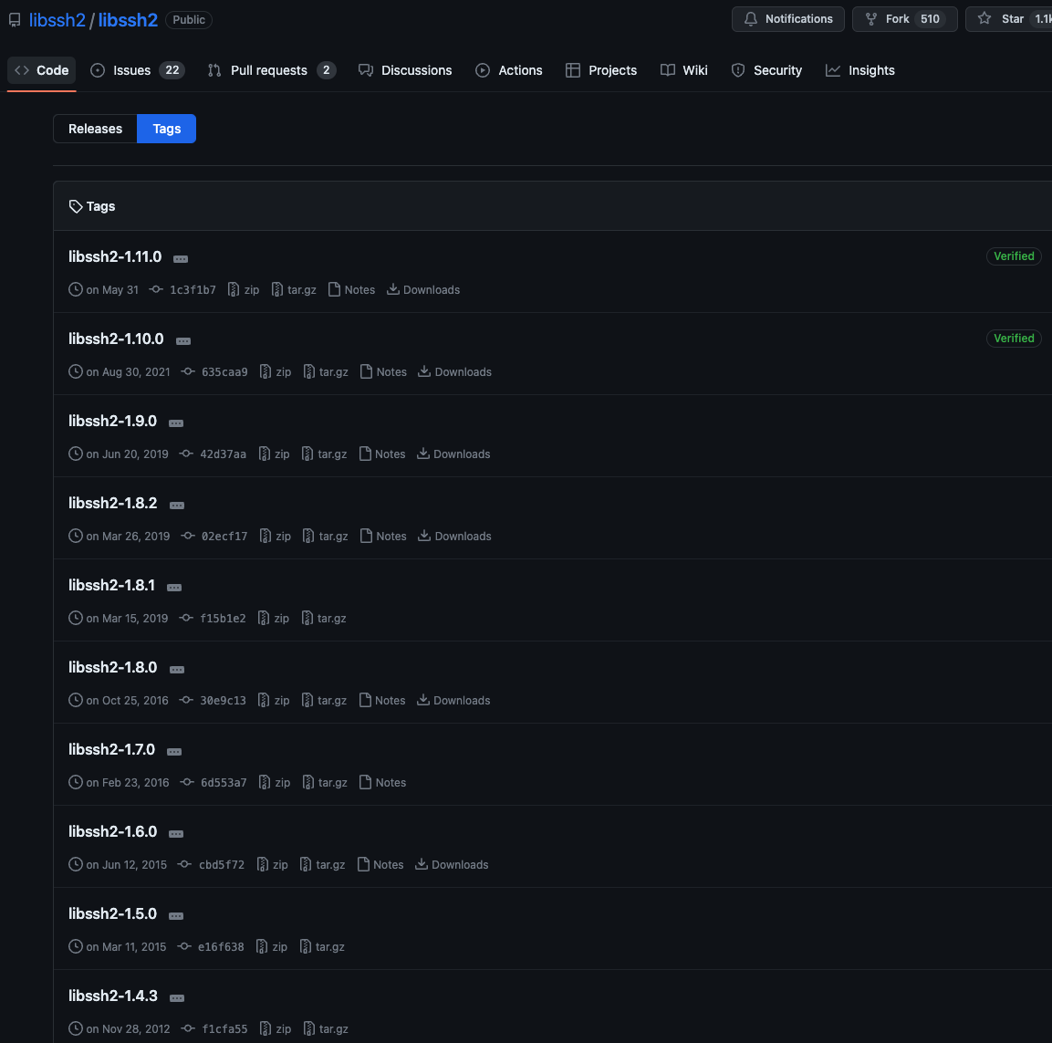 (libssh2는 깃헙 레포지터리를 관리하고 있다. 이 곳에서 소스코드를 디테일하게 분석할수도 있고, tags 페이지를 통해 필요한 버전으로 checkout하기에도 참고할 수 있다.)