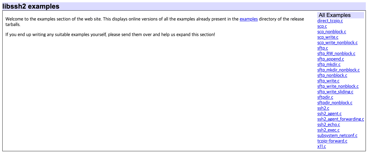 (scp, sftp를 활용하는 libssh2 라이브러리 예제 코드도 볼 수 있다. 라이브러리를 처음 임포트해서 사용할 때 참고하면 큰 도움이 된다.)