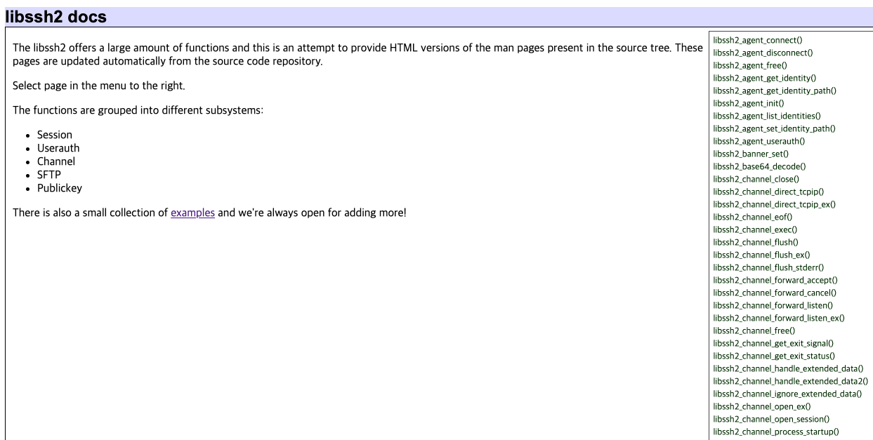 (libssh2는 많은 양의 기능을 제공하며 HTML형식으로 제공한다. 이러한 페이지는 깃헙 소스 코드 레포지터리에서 자동으로 업데이트된다. libssh2에서 제공하는 기능을 크게 아래의 카테고리로 구분할 수 있다.