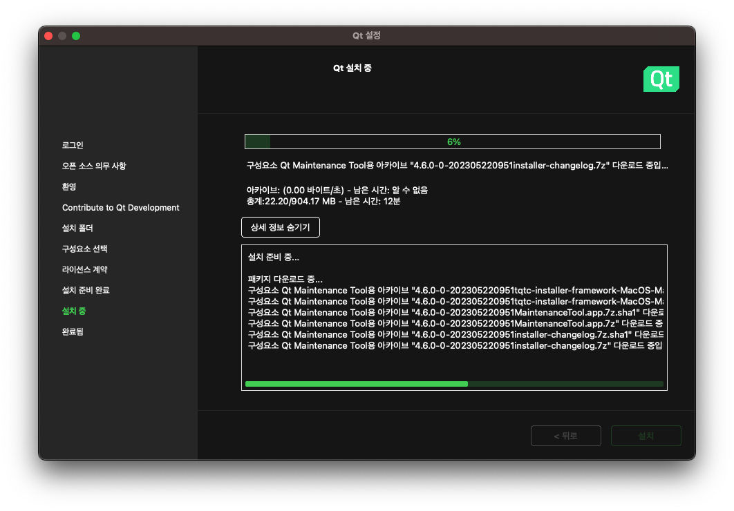 만약, Qt 컴포넌트 패키지 설치가 더 필요하다면 커스텀 설치를 진행하면 된다.