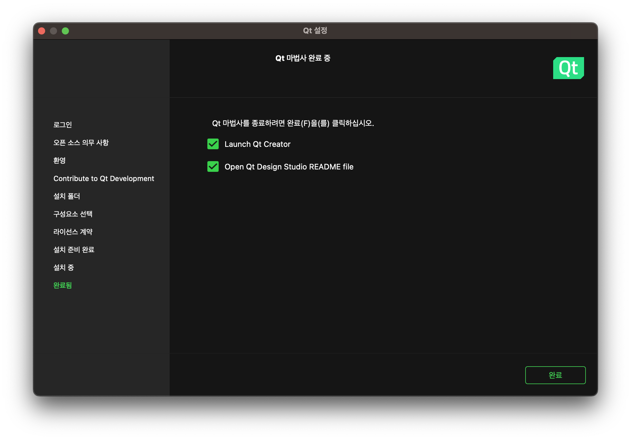 3. '완료' 버튼을 누르면 Qt Creator가 실행된다!
