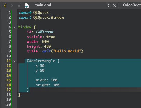 생성한 qml파일로 가서 Rectangle을 선언하고 내부 프로퍼티를 아래와 같이 초기화합니다.