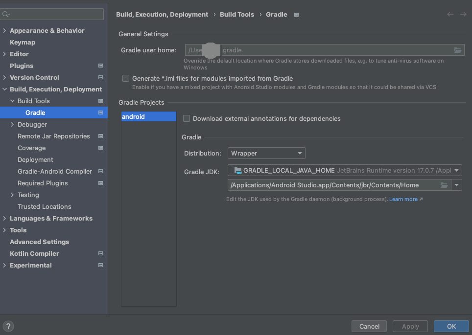 - Android Studio에서는 AndroidStudio > Settings 에서 프로젝트의 JDK 버전을 변경할 수 있습니다. Build,Execution,Deployment > Build Tools > Gradle 섹션에서 JDK 경로를 확인하고 필요한 경우 수정합니다.