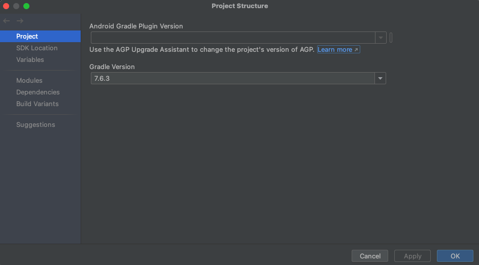 - Android Studio에서는 File > Project Structure에서 프로젝트의 Gradle 버전을 변경할 수 있습니다. Project 섹션에서 Grade 버전을 확인하고 필요한 경우 수정합니다.