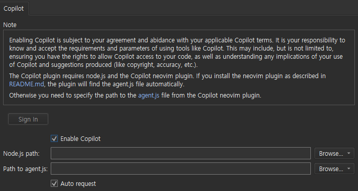2. Preferences 메뉴에서 Copilot 탭을 선택하여 인증을 진행합니다.